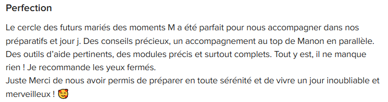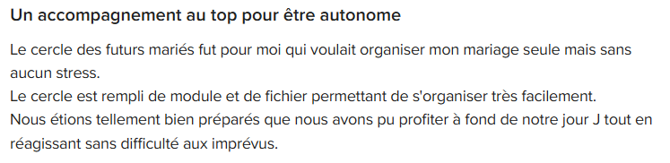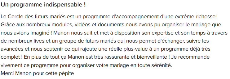 Vous aurez également accès à une communauté de soutien sur Telegram où vous pourrez échanger avec d’autres mariées. Vous pourrez vous motiver, vous encourager et partager vos bons plans.
