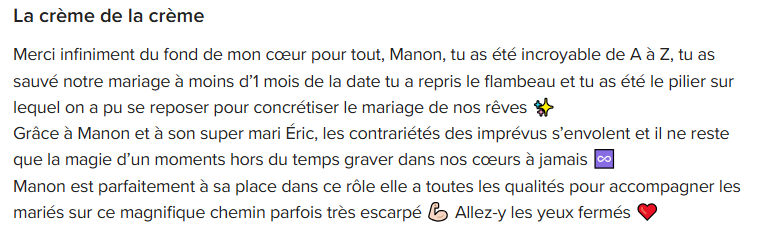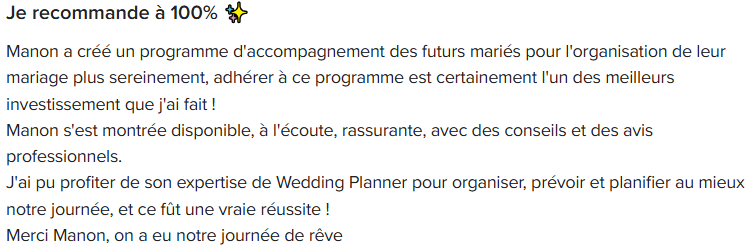 Les conseils et outils que je propose sont basés sur 4 années d’expérience et ont été testés et approuvés par plus de 100 couples avec des idées et goûts différents.